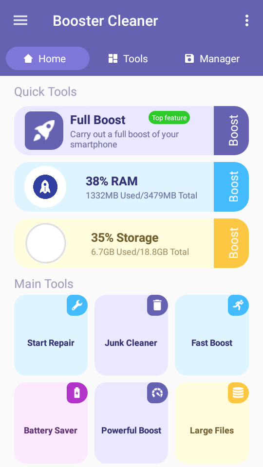 下载带有修复功能的免费助推器清洁器,让您的小工具的工作过程更快更好。使用修复系统 android 应用程序,您会惊讶于您的设备在完全修复后的速度有多快。
