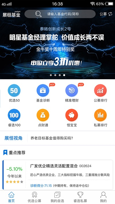 展恒基金网手机版是一款集多种理财产品、快捷交易、费率优惠和贴心服务于一身的理财应用。其产品覆盖公募、私募、固收等多个领域,交易开户简便,交易速度快,费率优惠力度大。点财通会员更享终身免申购费特权,而且用户还能享受到定期理财投资讲座和贴心服务。同时,展恒基金网手机版拥有强大的基金投研团队,为用户提供专业的投资建议和研究报告,是一款值得信赖的理财工具。
