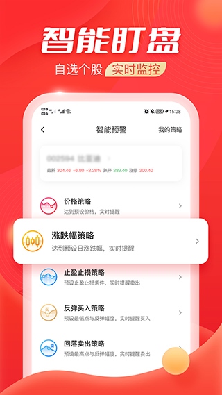【智能盯盘,时刻抓住机会】实时通知股价快速变动、超大单交易等50余项盯盘事件。智能预警功能包括自选股异动、止盈止损提示,让您不再错失操作良机。