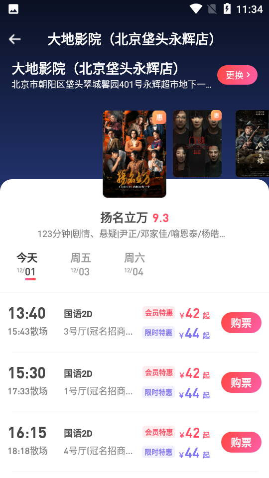 2、提供了大地院线全部大地数字影院的在线购票服、查看影院实时排期和价格;
