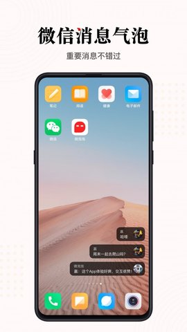 微泡泡可以帮你快速恢复各种sns消息。看剧或者玩游戏的时候,qq,微信等。来回复消息,通过微气泡直接在桌面恢复即可,方便快捷,无需来回切换软件。还可以帮你保存聊天记录。一个简单易用的微信工具,可以帮助你在手机上设置微信聊天消息弹窗,让你获得更好的聊天体验。你可以在软件中根据自己的需要设置各种泡泡,不管你玩的是什么应用或者游戏。如果有人给你发微信,你不用退出app,直接在微泡泡的泡泡弹窗里回复,非常好用。感兴趣的小伙伴们快来下载试试吧!