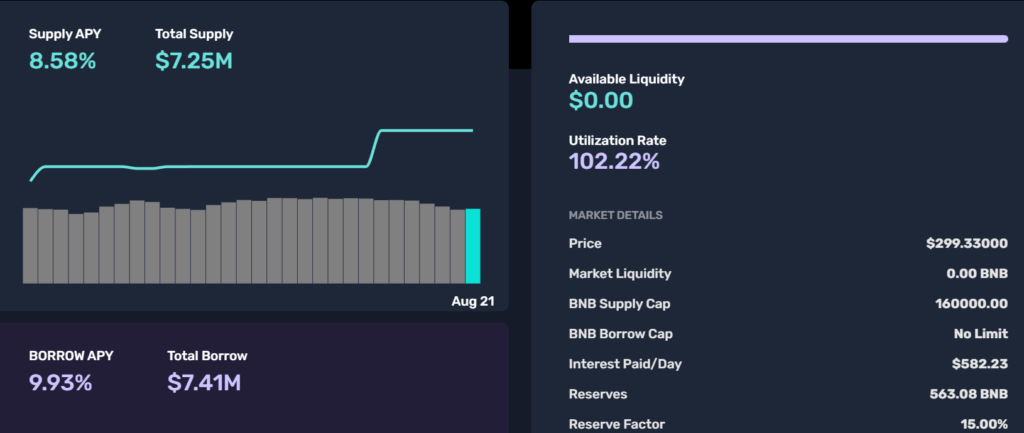 据当前Cream Finance的数据显示,当前BNB存款金额为725万美元,但借款金额却是741万美元,而当前BNB借款池可利用流动型已归零,存款利用率达102.22%,明显有不合理的地方;该地址在Debank上显示仅为借入25,725BNB,且并没有存有任何资产。