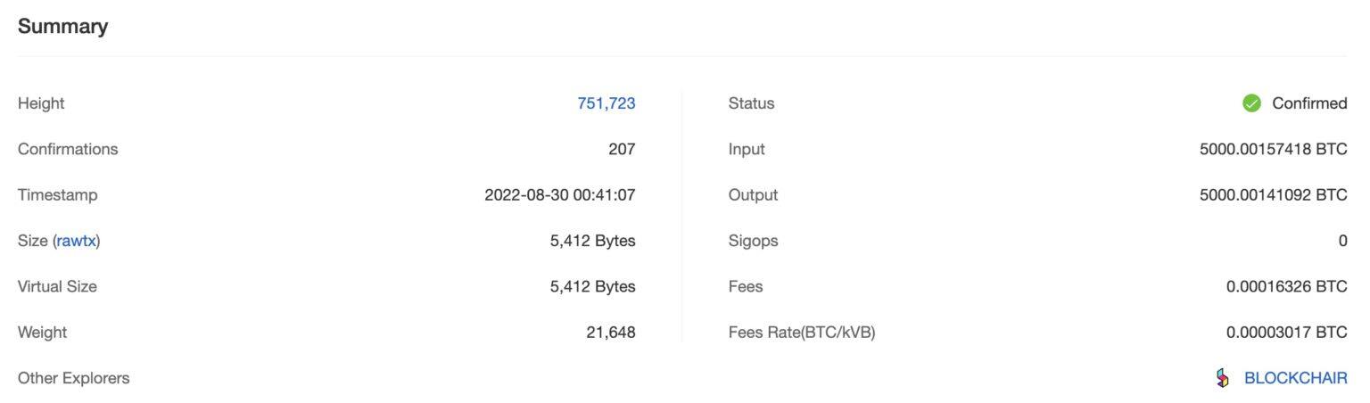另一笔5,000 *** C转账于8月30日发送,并在区块高度751,723处确认