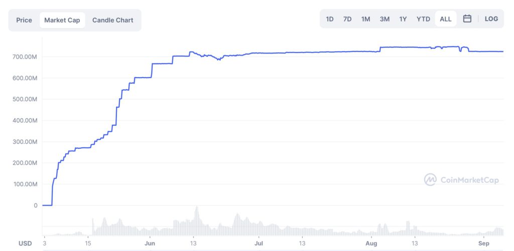 据Coinmarketcap数据,USDD当前在整体稳定币市场中排名第七,市值于6月中旬突破7亿美元之后,近三个月来仍维持在差不多的水平,现报7.24亿美元。