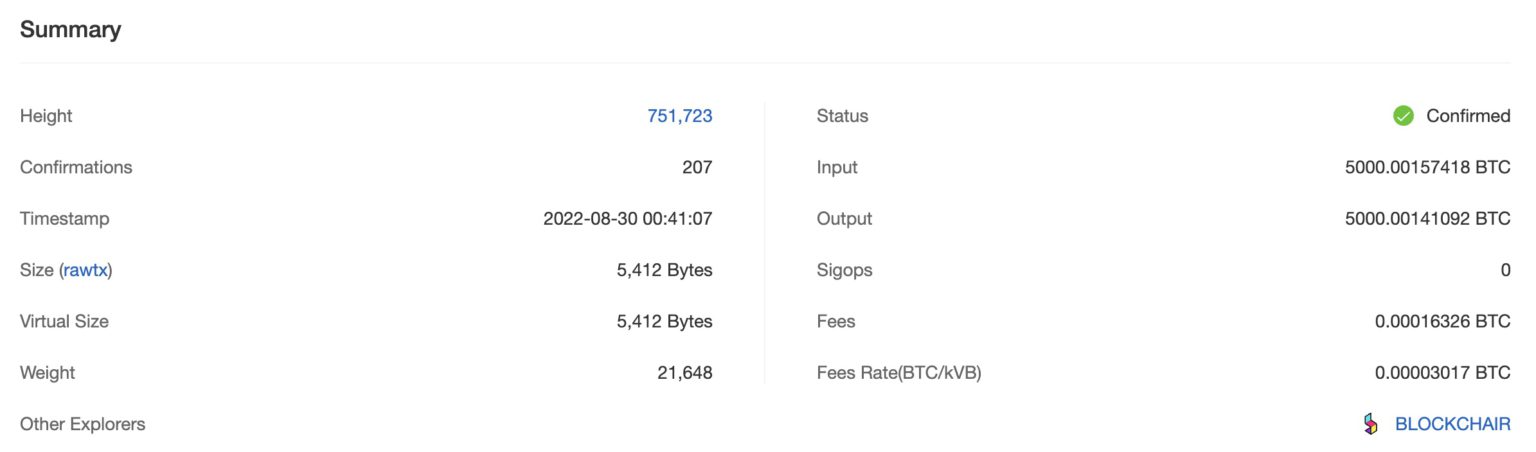 另一笔5,000BTC转账于8月30日发送,并在区块高度751,723处确认