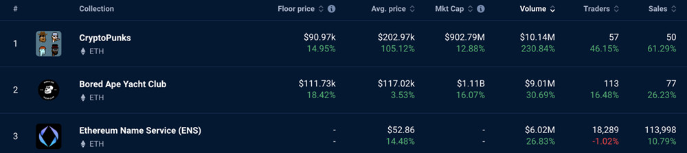 根据DappRadar数据显示,CryptoPunks近7日交易量突破1000万美元,位居所有NFT系列第一名,地板价格则上升至67.45ETH。