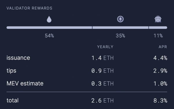 按照ultrasound网站10/21统计,验证者可得年化8.3%(增发奖励、交易小费、预估MEV获利):
