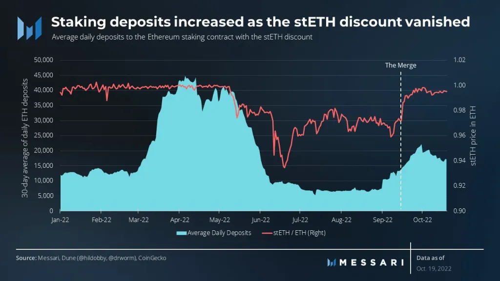 质押协议Lido推出的质押凭证stETH,一度在今年五月至九月发生折价,即低于ETH的市场价格。在合并后,就恢复了等价关系,每日新质押的ETH也从八月的7300增加到十月的13500个。