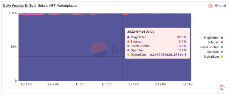 以太坊上最大的交易市场OpenSea也于今年四月进军Solana市场,不过根据DuneAnalytics上面的数据,OpenSea的表现不尽理想,至今交易量占比依旧微乎其微,Magic Eden则站稳龙头宝座。
