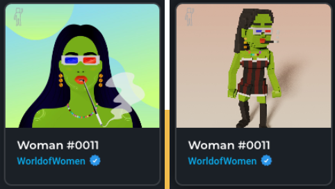 只要将鼠标移至有兴趣的NFT上,便会呈现在游戏中的实际模样,点选后便会跳转至OpenSea方便玩家直接购买。以下为World of Women的前后对比图: