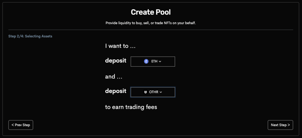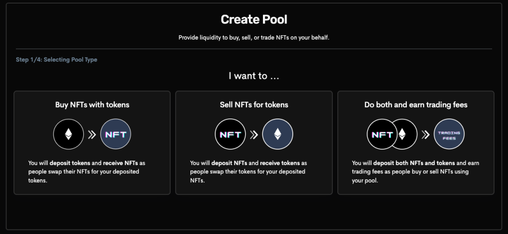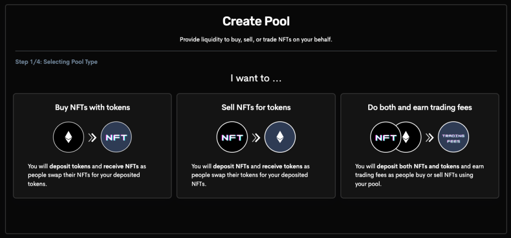 流动性提供者在创建池子时可以选择提供单边或双边的流动性,提供NFT作为流动性会获得ETH,反之则是获得NFT。如果是提供双边流动性,NFT价格为因池子的比例发生改变,而流动性提供者在每次的交易都可以赚取部分交易费用。