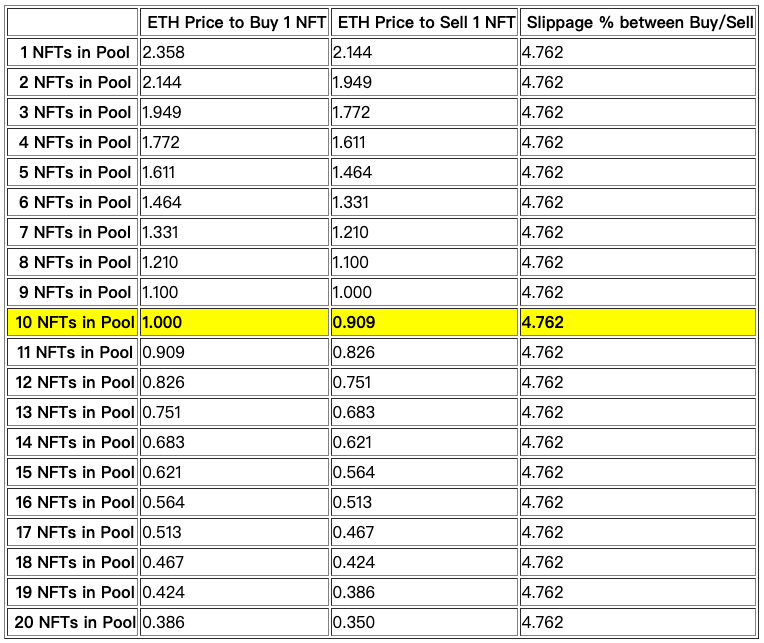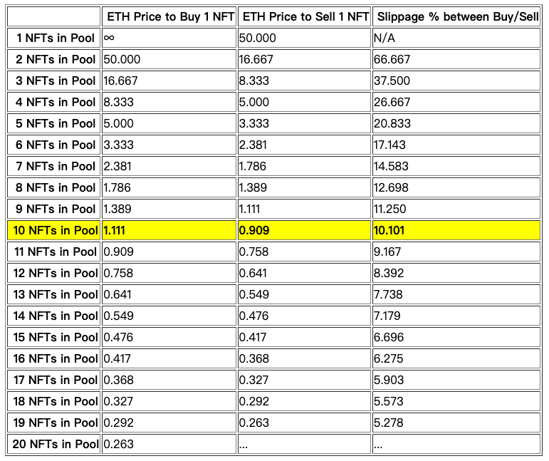 假设有个流动性池由10个NFT及10枚ETH所组成,此池采用x*y=z的恒定乘积算法,也就是10*10=100,而要在此池子购买或售出NFT的价格如下。