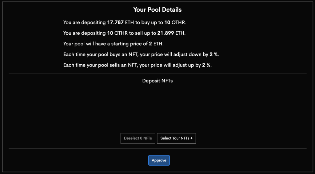 最后一个步骤为选择要添加至流动性池中的NFT,并确认参数设定是否正确,授权合约后便创建成功。