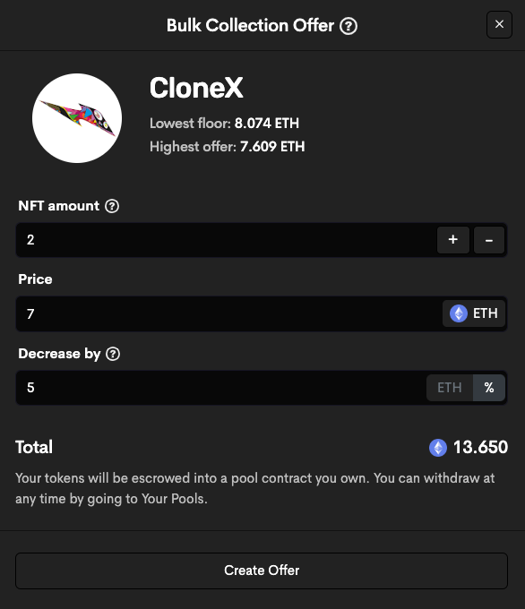 另外,Sudoswap也提供了NFT系列报价(Make Collection Offer)的功能,类似于限价单功能。不过其背后原理为创建一个提供单边流动性的池子,也就是提供ETH并获得NFT。