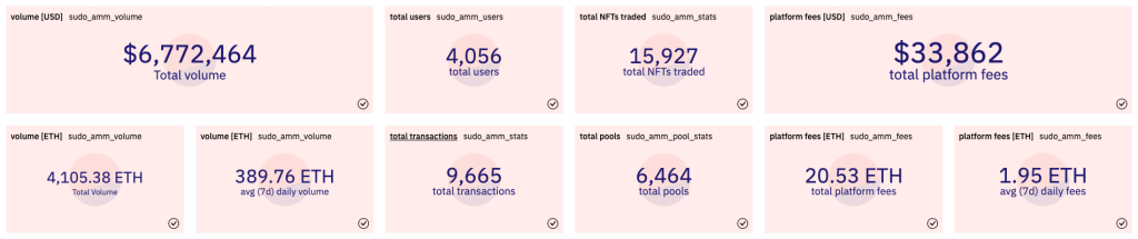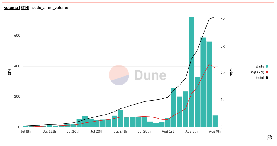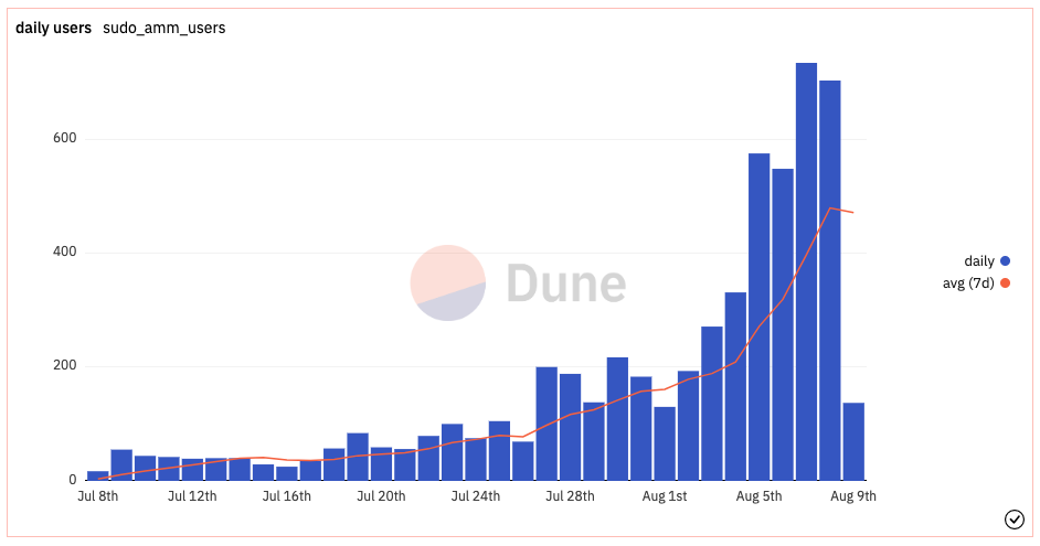 根据DuneAnalytics的数据,Sudoswap自7月初发行以来已累积了约677万美元的交易量,仅收取3.3万美元的平台费用。目前共有6,464个流动性池,4,000名以上用户。