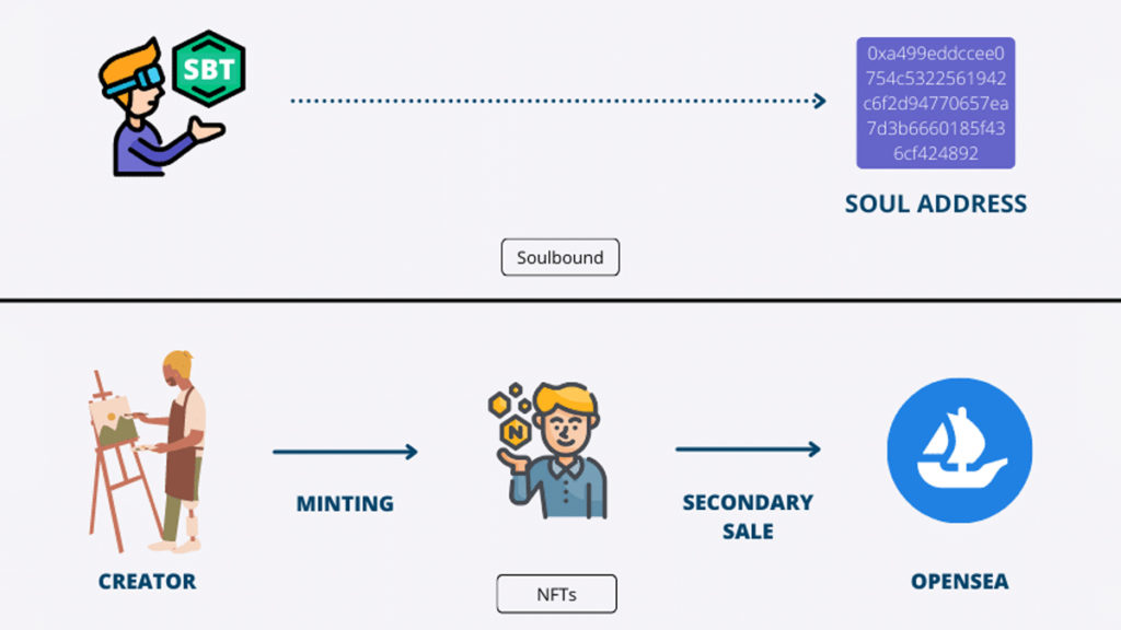 第一次听到灵魂,你或许会觉得奇怪。那是因为论文中将账户称为灵魂,持有的代币则称为灵魂绑定代币(SBTs)。简单来说,SBT是一种不可转让的代币,用来构成Web3网络上代表社会关系的承诺、证书或是从属关系,将一个人或实体的无数特征和成就,以区块链的形式进行标记。(例如:教育证书、就业历史、出席证明,甚至是他们的艺术作品证明)