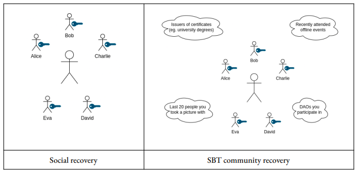 为此,V神在论文中就提议,我们可以在社区内采用一种称为「社会恢复模式」的方法。用户可以指定一组个人或机构作为「监护人」,如果用户钱包被泄露,这些监护人有能力访问和更改用户钱包的私钥。以这种模型出发,我们可以设计出类似的方法,以恢复灵魂的私钥。