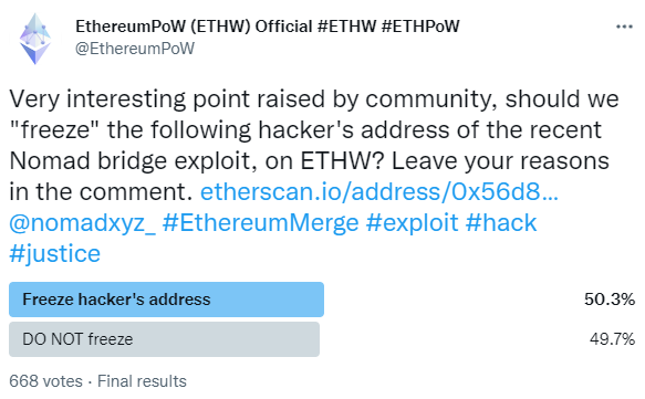 在此次公布冻结名单前,ETHW曾对推特网友举办投票,询问是否要分叉后冻结黑客的地址,让其不能领取ETHW分叉币,结果共有668网友参与投票50.3%的人赞同冻结黑客地址,相较于不同意仅领先0.6%。
