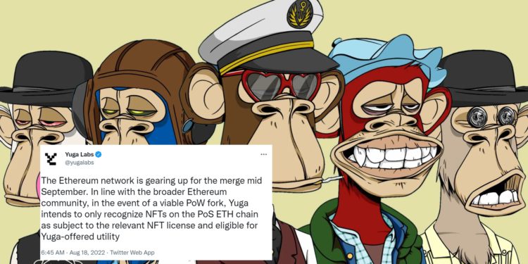 币圈子(120BTC.com)讯:随以太坊合并的预定时间逼近,ETH PoW硬分叉眼见已无可避免,让各方项目纷纷表态是否支持ETHW。无聊猿母公司Yuga Labs今发布声明表示,自家旗下NFT专案将认定ETH PoS链。