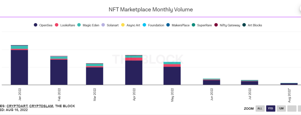 自加密市场入熊后NFT的交易量屡屡下滑,根据NFT数据平台CryptoSlam,本月至16日包含前四大交易量的NFT交易所(OpenSea、LooksRare、MagicEden、SuperRare)总交易金额仅2.67亿美元,比照7月总交易金额6.75亿美元,月交易额推估将再下滑。
