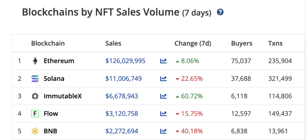 根据NFT数据观测站《CryptoSlam》显示,近一周内Solana上的NFT交易量下滑了22.65%,总交易金额为11,006,749美元。以太链上NFT一周内交易量上升8.06%,总交易金额126,029,995美元。