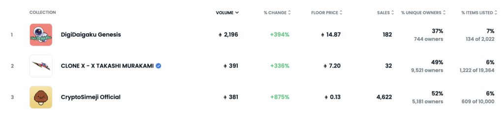 币圈子(120BTC.com)讯:整体NFT市场交易量本月来到近一年来新低。但尽管如此,我们不时仍可在低迷的市场中发现某些新项目逆势上涨、脱颖而出。据Opensea近24小时纪录,8月9日才公开发行的NFT项目DigiDaigaku近24小时交易量增长394%达到2,196ETH(现价约350万美元),赢过一众蓝筹项目,空降Opensea第一名宝座。