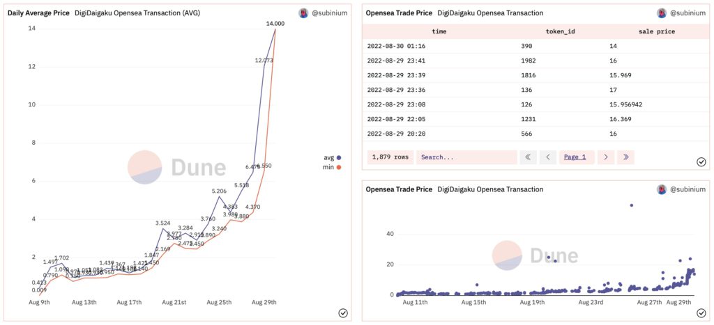 其地板价的涨幅则更是惊人。DigiDaigaku限量发行2022枚并采取免费铸造(当时gas成本约0.003ETH),但仅第一天的地板价就来到0.4ETH并一路上涨,目前现报15.8ETH(现价约2.46万美元),短短不到三周的时间就创造了数千倍的收益。