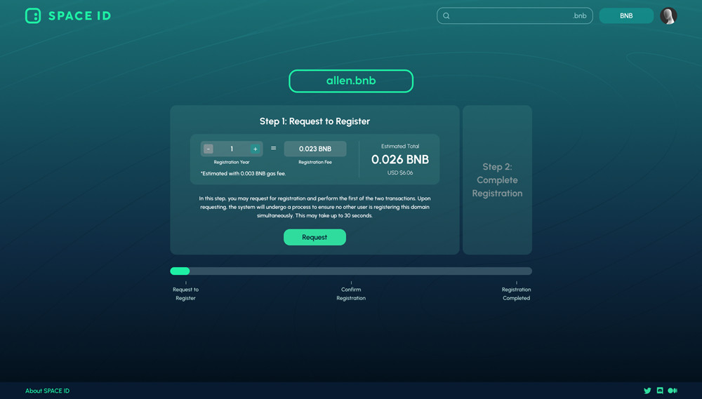 项目方解释.bnb公开注册过程将有两大步骤:请求注册和完成注册,这两个步骤是为了防止其他用户尝试注册同一域名并在用户请求注册后给予保护。