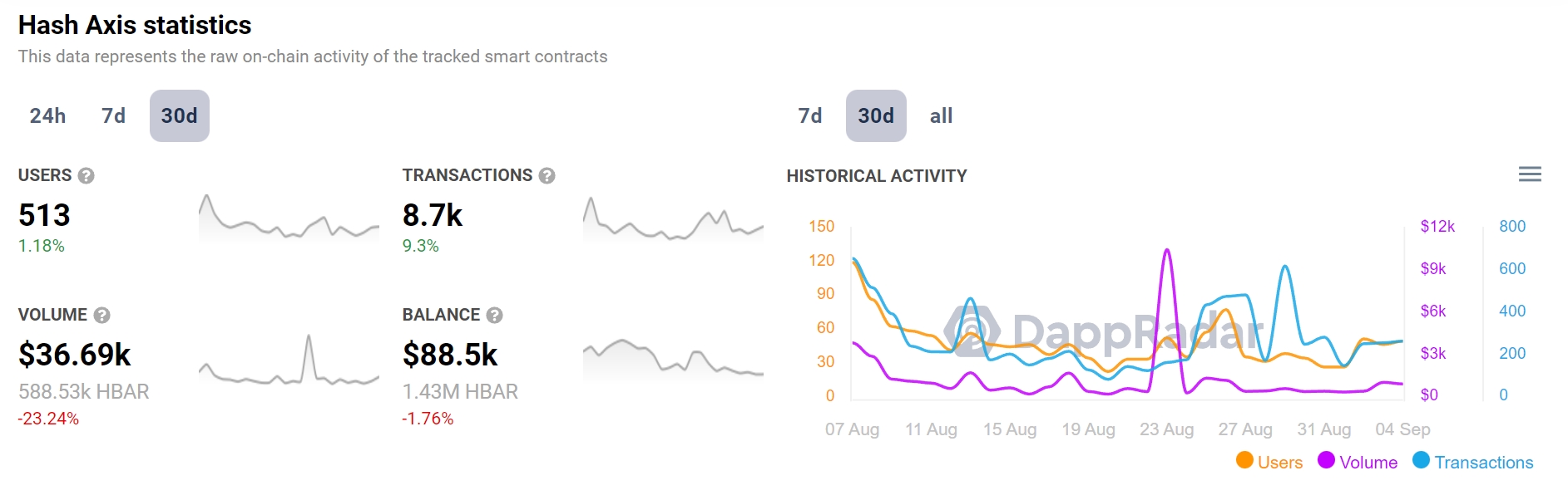 LG选择采用Hedera区块链,并非是一个显而易见的选择。据DappRader数据,过去30天以来,Hedera主要NFT市场Hash Axis交易量仅约3.66万美元,用户只有513个,相较之下,基于以太坊的OpenSea上的交易量达到3.3亿美元,用户超过30.5万个。