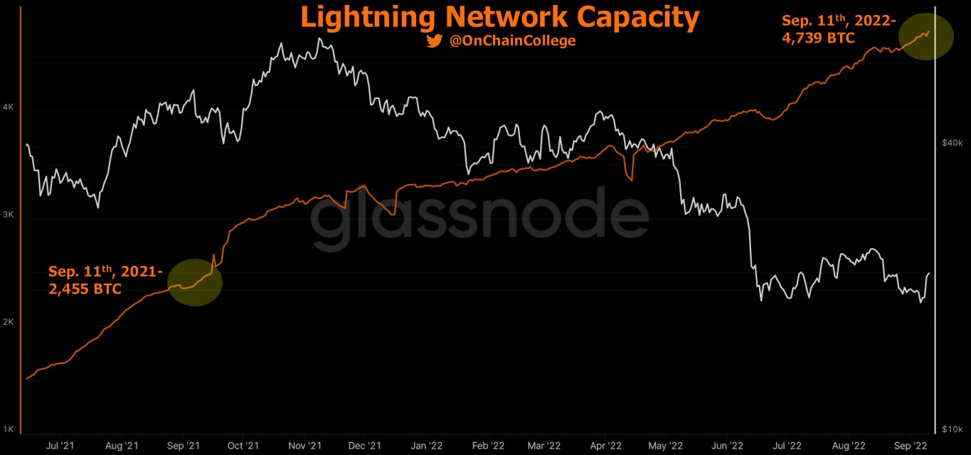 加密货币市场分析师On-ChainCollege在推特上分享Glassnode数据指出,截至9月11日,比特币闪电网络锁定的比特币数量为4739枚,相较于去年9月11日时的2455枚,在短短1年内,增幅已超过93%。