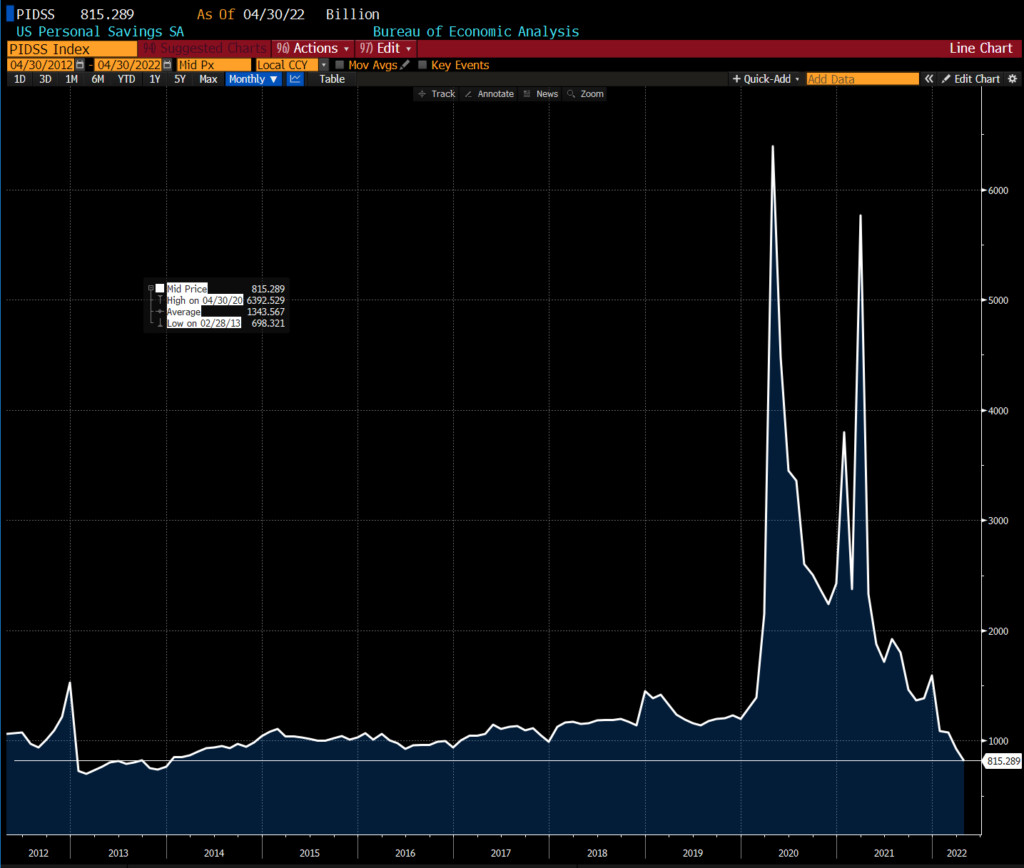 “美国个人储蓄下降到2013年的水平,储蓄率下降到2008年的水平—而循环信用卡债务以创纪录的速度增长,回到了疫情前的峰值,尽管有数兆现金的经济刺激。消费者衰退和更多的收入问题,迫在眉睫。”