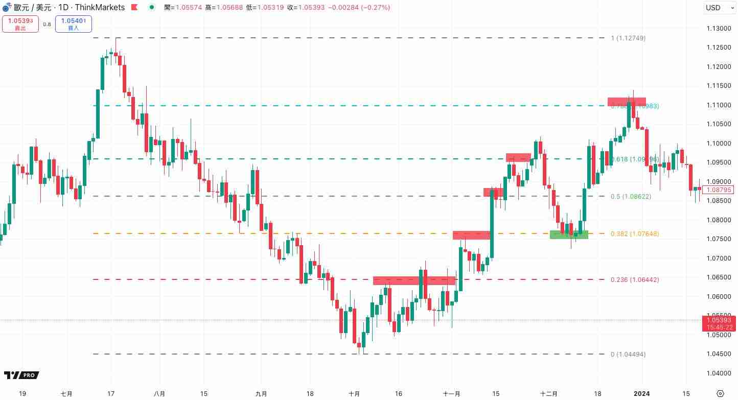 以上图为例,欧元兑美元在反弹至0.236上方后得到了明显的支撑,同时移动平均线(MA)出现了黄金交叉,表示了短期趋势有进一步反弹的迹象。此时交易员可以考虑做多欧元兑美元,并关注下一个0.382的阻力位。
