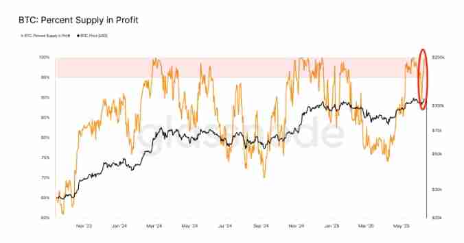 同样,在Circle的IPO时(2025年6月5日),比特币的盈利能力为89.17%,随后迅速上升至约99%,显示出类似的市场热情水平(如下图红圈所示)。这种高盈利性表明大多数比特币持有者都处于盈利状态,这通常是获利回吐的前兆,可能会压低价格。与Coinbase上市的相似性表明,Circle的IPO可能反映了一个已经过热的市场,如果情绪转变,投机热情可能导致波动。