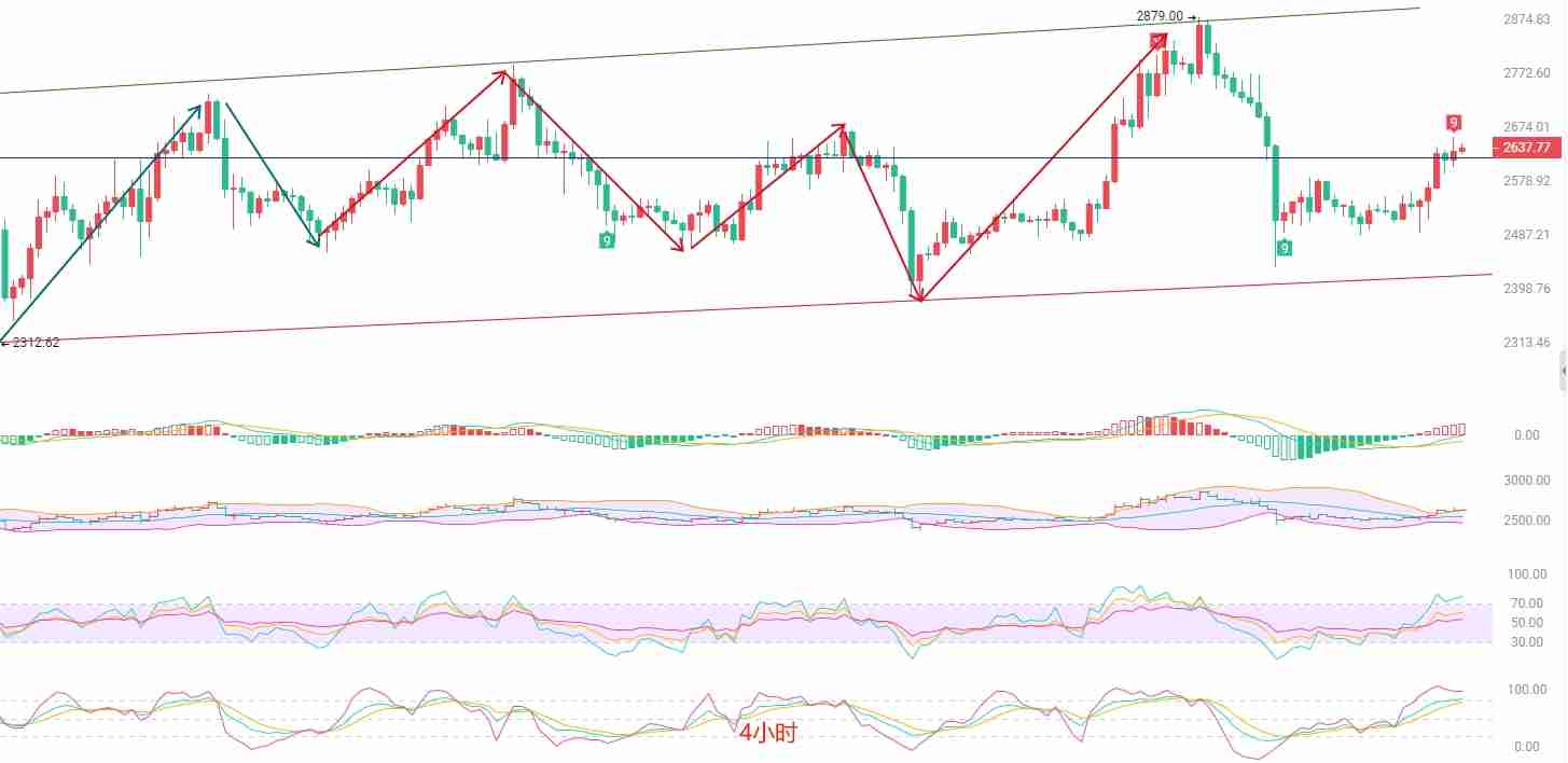 观察日K线图,发稿前最高价为2656美元,最低价为2513美元。EMA趋势指标依然呈现收缩态势,向上交替扩散的趋势受到阻碍,仅剩最后一根均线就将结束扩散趋势。MACD指标连续缩量背离,DIF和DEA指标逐渐靠近0轴线。布林带则呈现连续长时间横盘形成的箱体,上轨压力位在2780美元,下轨支撑位在2400美元。预计短期内大概率还会延续向上扩散的走势。